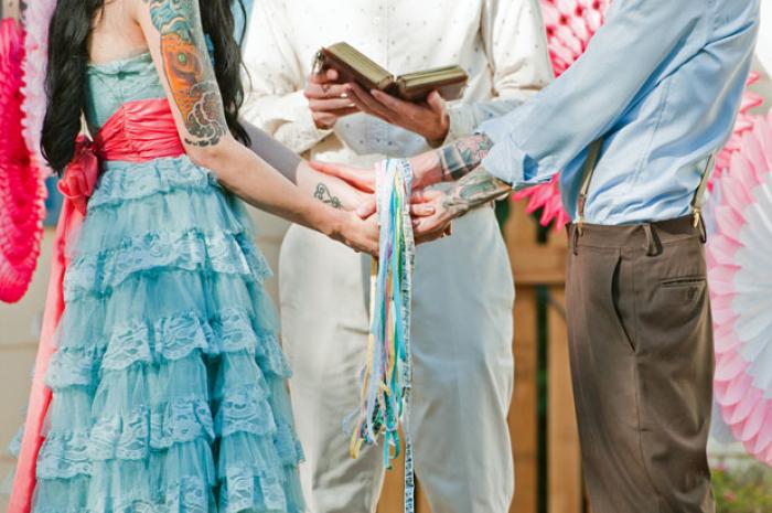 Couples would clasp their hands together and a cord would be wrapped around them to symbolize unity in marriage while exchanging vows...literary they're "tying the knot"